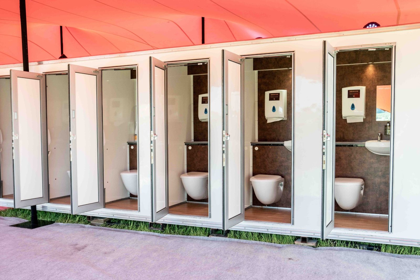 Fresh water flushing, “cleaned after every use” porcelain toilets, fully enclosed cubicles – featuring warm running water, Molton Brown hand-soap, and most importantly, mirrors!